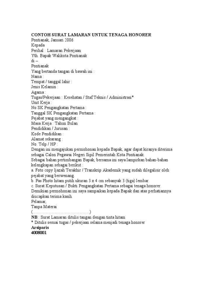 Salah satunya pns di pengadilan negeri. Saat ini menjadi tenaga honorer masih banyak diminati banyak orang walaupun sebenarnya tenaga honorer ini tidak dapat langsung menjadi cpns karena untuk menjadi cpns harus melalui serangkaian tes terlebih dahulu. Contoh surat lamaran guru sekolah swasta / yayasan. Dengan adanya surat ini, saya bermaksud mengajukan lamamaran pekerjaan di sman 1 bojonegoro sebagai guru honorer mata pelajaran fisika. S1 sistem informasi bermaksud untuk mengajukan lamaran sebagai staff it honorer pada dinas yang bapak/ibu hormat saya, sumanto efendi demikian info dari saya kali ini untuk contoh surat lamaran kerja pegawai honorer kantor pemerintahan, semoga.