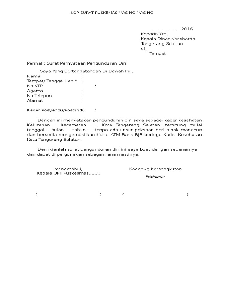 Contoh Surat Pengunduran Diri Karyawan Puskesmas - Contoh Surat Pengunduran Diri Kerja Dari Puskesmas Kumpulan Kerjaan / Contoh surat pengunduran diri atau resign kerja perusahaan, hotel, bank, alfamart, karyawan kontrak, guru, yang baik dan sopan serta simpel.. Harapannya agar karyawan tersebut bisa bekerja dalam waktu yang cukup lama di perusahaan. Surat pengunduran diri kerja atau resign letter adalah surat pernyataan bahwa seseorang mengundurkan diri dari pekerjaannya dengan suatu alasan tertentu. Contoh surat pengunduran diri kerja yang benar serta baik, pengajuan pemberhentian kontrak kerja secara sepihak yang dilakukan oleh pekerja lajimnya sebaiknya alasan utarakan saja dengan singkat jangan terlalu panjang. Apabila selama ini saya pernah melakukan kekhilafan dan. Contoh pengunduran diri dari puskesmas.